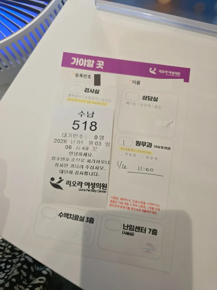 수납까지 끝내면 채취 당일 일정 끝! 그리고 일주일 뒤 방문한 리오라여성의원에서는 3일 동결배아 1개를 안내받았어요. 그대로 이식할지 아니면 다시 채취할지는 다음 생리 때 확인해 보자고 하셨답니다. 저도 제 몸이 어떻게 될지 몰라 걱정되지만 괜찮을 거라 생각하고 기다렸어요.
