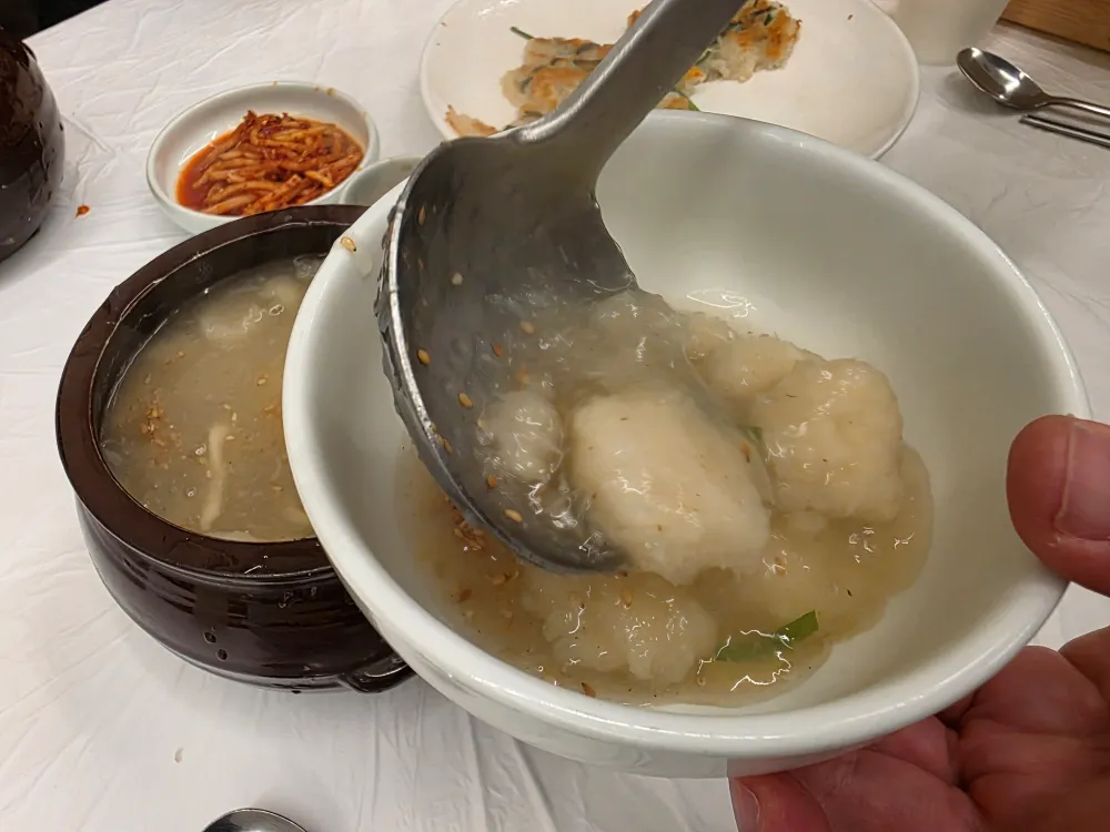 메뉴가 통일되니까 하나에 나와서 덜어먹을 수 있는 앞접시도 주셨어요. 아주 푸짐하게 담긴 감자옹심이와 따뜻한 국물이 벌써부터 맛있게 느껴졌어요. 실제로 먹어보면 쫀득한 식감이 가득하고 입 안에 고소함이 맴돌아서 더불어 주는 김치와 너무 잘 어울렸어요. 배고파서 말 한마디 없어 먹었는데 어찌나 맛있던지...