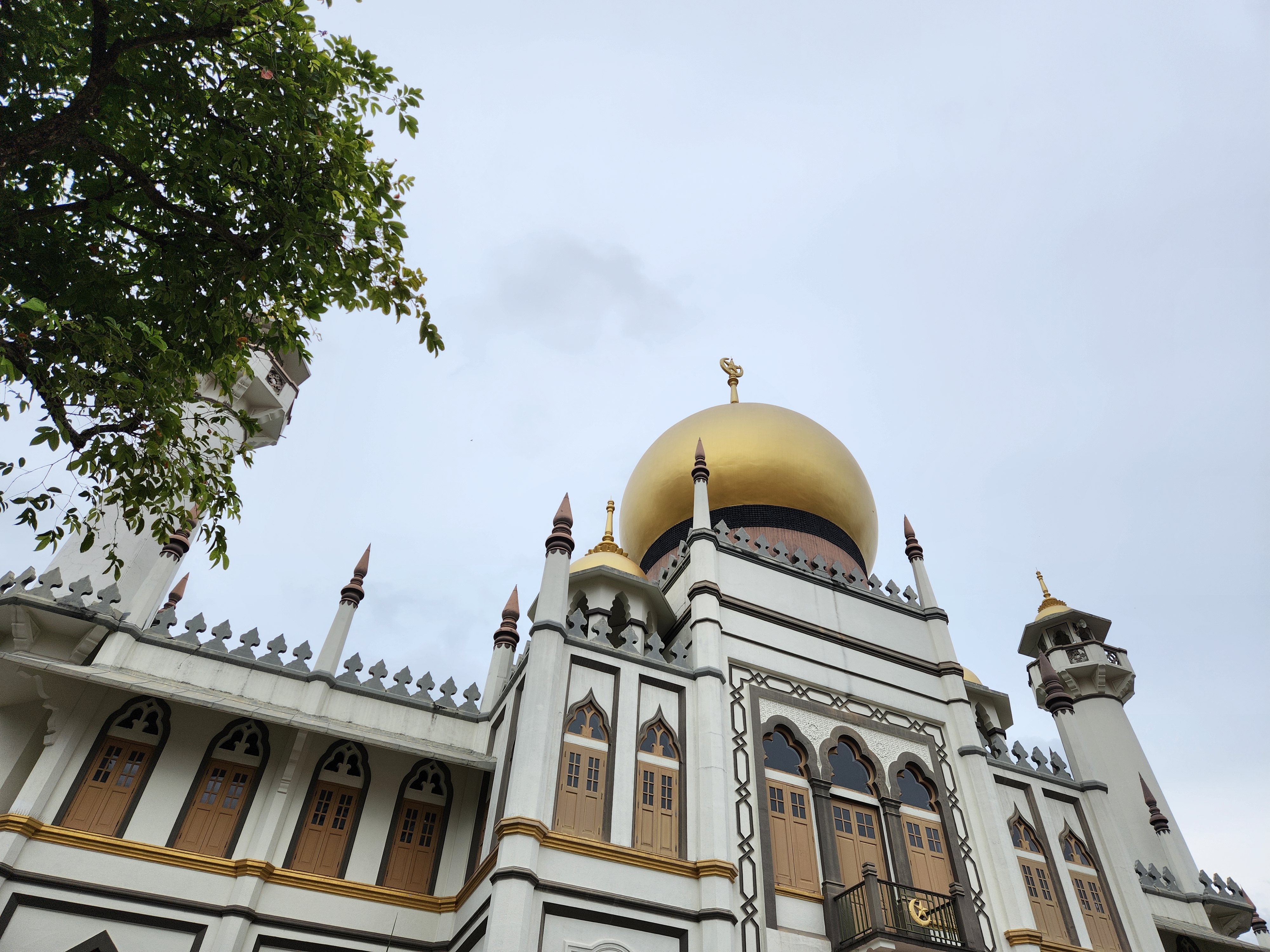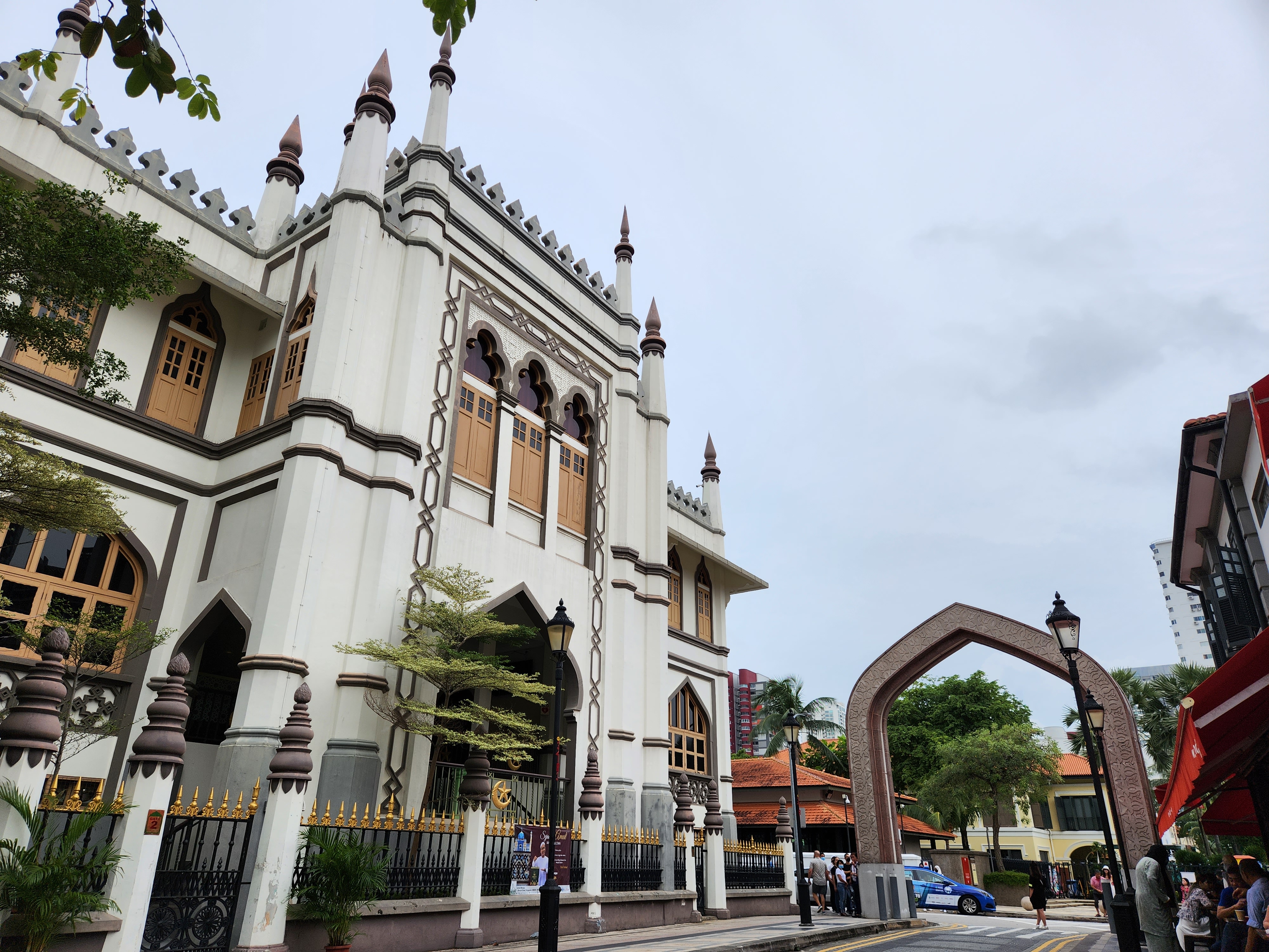 여기가 술탄 모스크에요. 싱가포르 여행에서 빠지지 않는 거리들과 건축물인데 최초의 술탄 후세인샤를 위해 건립된 곳이에요. 이 나라에서 가장 화려한 종교 건축물에 속하고 규모가 커서 사진 한 컷에 다 담기기 어려웠어요. 일반인도 들어갈 수 있는 시간대가 있다고 하는데 저희는 패쓰!
