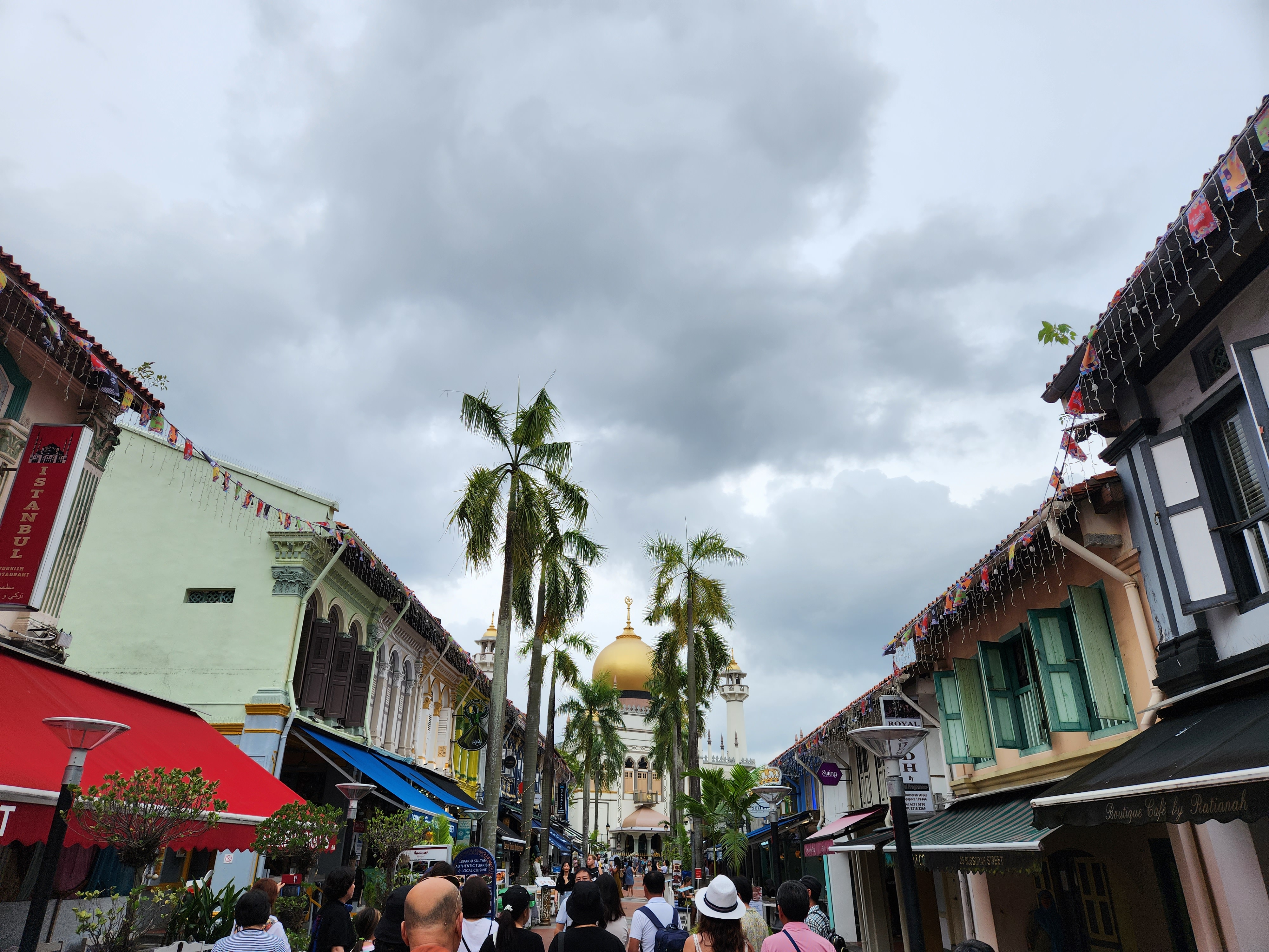 여기가 술탄 모스크에요. 싱가포르 여행에서 빠지지 않는 거리들과 건축물인데 최초의 술탄 후세인샤를 위해 건립된 곳이에요. 이 나라에서 가장 화려한 종교 건축물에 속하고 규모가 커서 사진 한 컷에 다 담기기 어려웠어요. 일반인도 들어갈 수 있는 시간대가 있다고 하는데 저희는 패쓰!