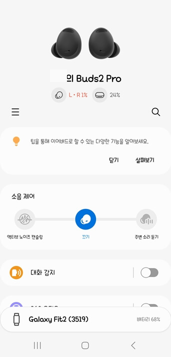 저는 갤럭시핏 2도 사용하고 있어서 같이 뜨는 거예요. 배터리 용량과 함께 글자를 터치하면 Galaxy Wearable 어플이 갤럭시핏 2 설정으로 넘어가거든요. 어쩌다 보니 몇 년째 갤럭시를 사용하고 있고 운동한다는 핑계로 갤럭시핏을 구매했더니 컴퓨터가 필요해 삼성 노트북을 구매했었던 지난 날들, 이번에 기회가 좋아 갤럭시 버즈 2 프로를 선물 받았어요! 신랑이 갤럭시폴드 4로 바꾸면서 100,000만 원권이 생겨 그걸로 구매했거든요 ㅎㅎ 물론 버즈 2 프로는 금액이 비싸서 저희가 돈을 더 줬지만 그래도 겸사겸사 연말 선물을 받았답니다-