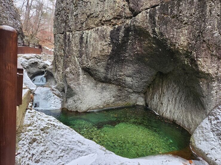 주왕산 등산 코스를 가려면 무조건 대전사를 지나가야 해서 입장료를 따로 지불해야 해요. 1인당 4,500원이고 카드로 결제하실 분들은 매표소 옆에 무인발매기가 있으니 참고해주세요. 그렇게 진입하면 자연경관에 쌓인 대전사를 만날 수 있어요. 저희는 들린 김에 기도 한 번 드리고 등산을 시작했어요. 날씨가 조금 더 좋았다면 하는 바람은 있었지만 비나 눈이 오지 않는 것만으로 충분하다 여겼어요.
