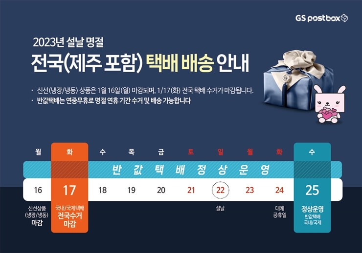 GS25 편의점 택배는 국내와 국제, 제주도를 따로 안내하고 있어요. 냉장이나 냉동을 해야하는 신선상품들은 1월 16일날 마감하고 국내와 국제택배는 그 다음날인 1월 17일날 마감해요. 그리고 모든 택배는 1월 25일날 정상운영하는 일정이에요. 어플에서 예약할 때에는 1월 17일부터 1월 23일까지 마감하며 반값택배는 연중무휴로 설 연휴기간 동안 수거와 배송 모두 가능하다고 해요. 미리 맡겨둔 택배는 설날 기간동안 배송이 가능하니 참고해 주세요.