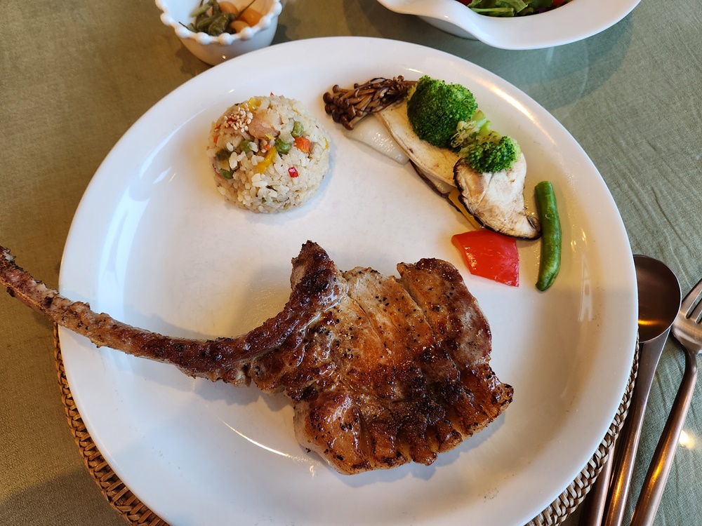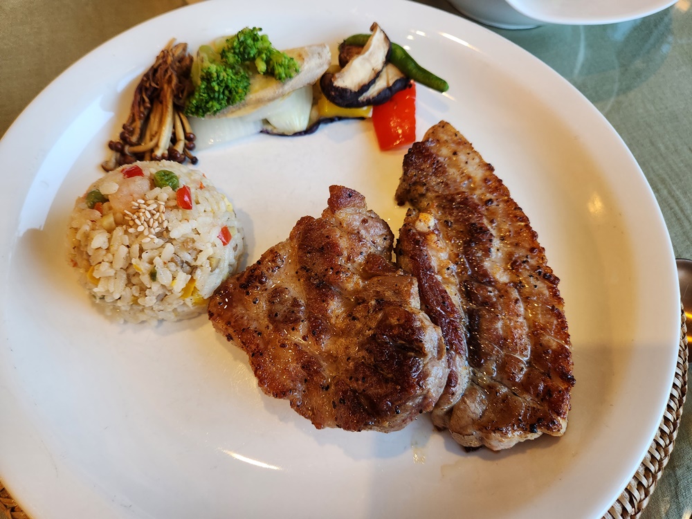 돈마호크보다는 삼겹살이 조금 더 부드럽고 맛있었어요. 돈마호크 자체도 짭조롬한 맛이 좋았지만 일반 삼겹살이 부드러워서 씹기가 좋았어요. 볶음밥과 야채까지 곁들여서 먹었더니 과일을 다 못먹는 상황까지 ㅠ_ㅠ.. 7시가 마지막 주문시간이라 1시간의 여유가 있어서 아주 천천히 다 먹고 나왔어요.