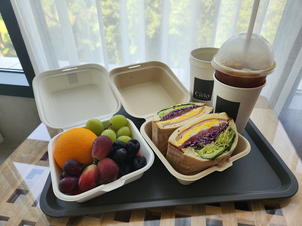 다음날 아침에 먹었던 조식이에요! 조식은 아침 8시부터 9시까지 1시간만 운영하고 샌드위치가 제공돼요. 음료는 커피와 차 종류가 있었는데 저희는 작두콩차 따뜻한 거 하나 주문했어요. 여기가 커피맛집인 거 소문내고 싶어서 사진 찍었는데 커피가 너무 맛있어서 취향 저격 당했어요. 커피만 따로 사서 나갈 정도였네요 ^^^^.