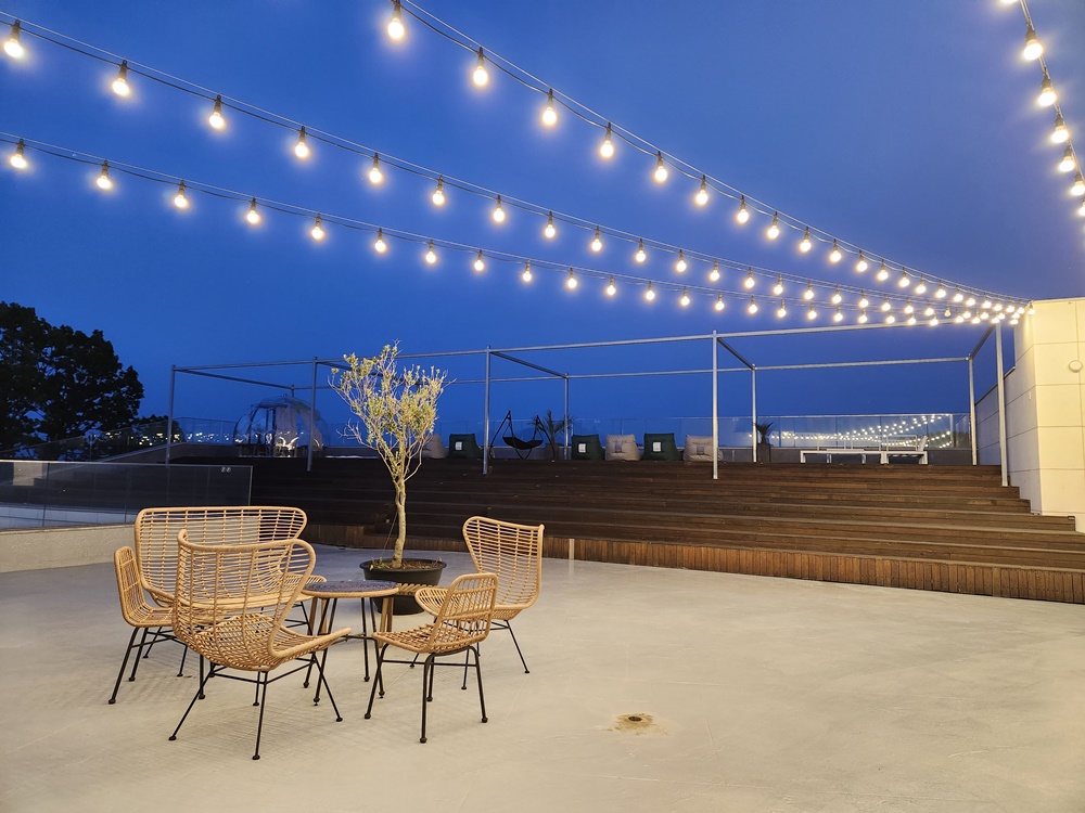 루프탑! 아직 조성중인건지 아니면 바람 때문인지 몇 개의 의자들은 구석자리로 이동해 있었어요. 루프탑도 시간이 정해져 있어서 오전 10시부터 저녁 10시까지만 오픈하고 있어요. 혹시 모를 사고를 대비한 듯 했고 한 여름철 되면 맥주 한 캔 들고 올라와서 쉬었다 가면 좋겠다고 생각했어요. 선선한 바람과 함께 바다 풍경을 바라보니 자연스레 힐링 됐던 기억!