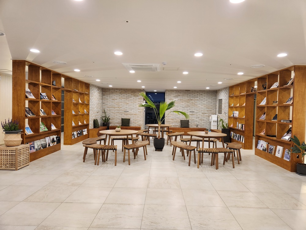 2층 북카페이자 쉬는 공간이에요. 생각보다 넓어서 여러 사람들이 앉아도 좁아보이지 않을 것 같아요. 끝 쪽에 정수기도 있어서 필요할 때 물 마실 수 있고 여기 근처로 남녀 화장실이 작게 있어요. 책은 대부분 잡지였고 어린이 동화책 몇 가지도 있었지만 개인적으로 가져와서 앉아 쉴 수 있는 공간으로 보였어요.